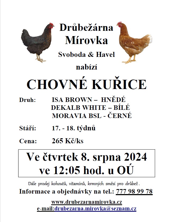 kuřice hnědé, černé a bílé - stáří 17 - 18 týdnů, cena 265 Kč/ks. Objednání (doporučujeme) je možné na tel.: 777 98 99 78 nebo drubezarna.mirovka@seznam.cz